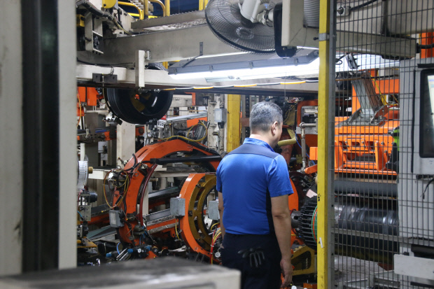 ![]() 금호타이어가 광주공장 노동자가 지난 5월 화재 이후 재가동을 위해 성형기를 확인하고 있다. <금호타이어 제공> |