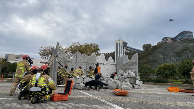 12일 오후 여수시 수정동 소노캄 호텔 인근, 노란빛을 띈 매캐한 연기가 퍼지자 소방헬기가 요란한 소리를 내며 호텔 옥상에 내려앉았다. 객실 투숙객들이 헬기에 탑승하는 동시에 인근 도로에서는 소방용 순찰 로봇이, 붕괴된 건물 내에는 구조견이 투입돼 부상자를 찾아나섰다. 뒤이어 건물 붕괴, 화재 발생 등 긴박한 상황 지시가 잇따라 쏟아지는 가운데 소방관들은 일사불란하게 현장 곳곳을 뛰어들어가 인명 구조 활동을 벌였다.