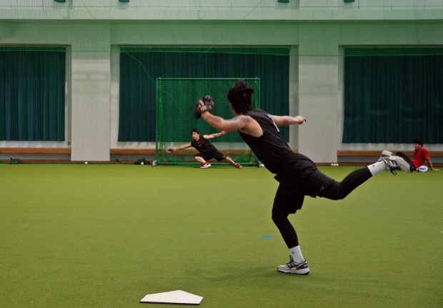 1루수는 포구가 가장 중요한 포지션이다. 악송구가 나올 경우 공을 잡지 못하더라고 어떻게든 앞으로 떨궈놓아야 하는 만큼 이를 익히게 하기 위한 훈련이었다.