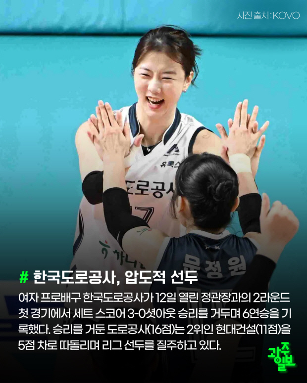 여자 프로배구 한국도로공사가 12일 열린 정관장과의 2라운드 첫 경기에서 세트 스코어 3-0 셧아웃 승리를 거두며 6연승을 기록했다. 승리를 거둔 도로공사(16점)는 2위인 현대건설(11점)을 5점 차로 따돌리며 리그 선두를 질주하고 있다.