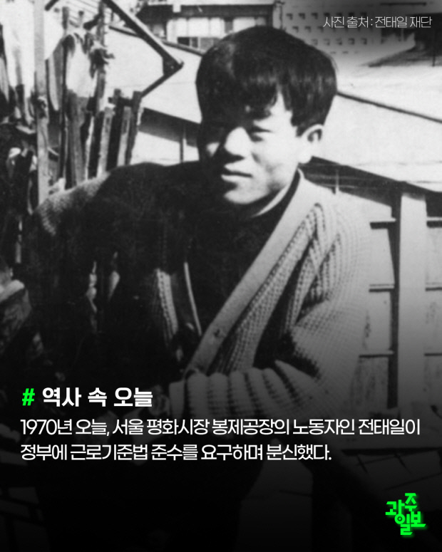 1970년 오늘, 서울 평화시장 봉제공장의 노동자인 전태일이 정부에 근로기준법 준수를 요구하며 분신했다.