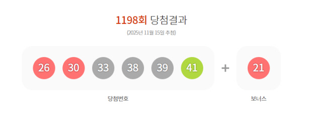 15일 진행된 제1198회 로또복권 추첨에서 ‘26, 30, 33, 38, 39, 41’이 1등 당첨 번호가 됐다.