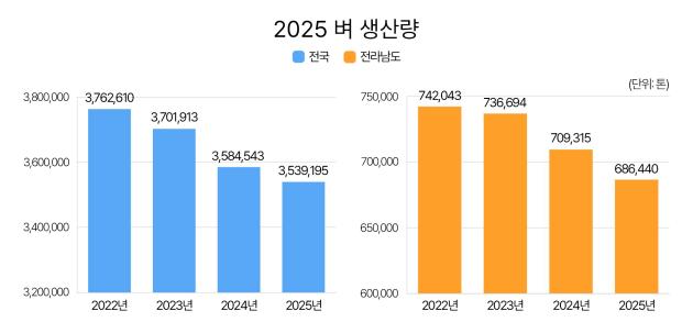 2025년 전국 및 전남 벼 생산량/그래픽=안재현 인턴 기자 screamsoloo@gmail.com