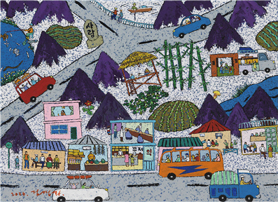‘고향 가는 길’은 동화 속 어떤 나라를 향해 떠나는 여정 같다. 세모난 산들과 손바닥만한 밭, 그 사이를 내달리는 버스와 자동차, 트럭 등은 평화롭기 그지없다. 자본주의에 물들지 않는, 범죄라고는 발생할 것 같지 않은 손수한 세계가 펼쳐져 있다. 아마도 작가에게 고향은 동화에 나오는 어떤 아름다운 작은 나라인 듯하다.