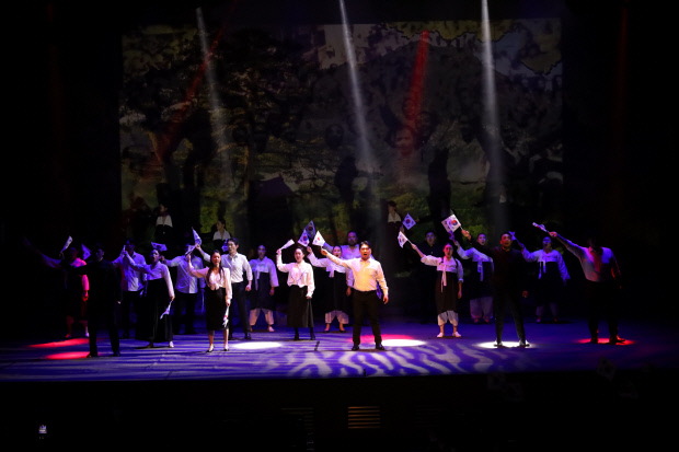 작품에는 영화의 주제가인 ‘경기아리랑’을 비롯해 ‘진도아리랑’, ‘밀양아리랑’ 등 여러 지역의 아리랑 선율이 자연스럽게 어우러진다. 시대와 장소를 넘어 이어져 온 아리랑의 흐름을 무대 위에서 한눈에 보여주며 작품의 정서를 넓히는 데 초점을 맞췄다. 여기에 백범 김구 선생의 ‘세 가지 소원’ 나레이션과 ‘애국가’가 더해져 당시 사람들이 품었던 독립의 열망을 환기한다.