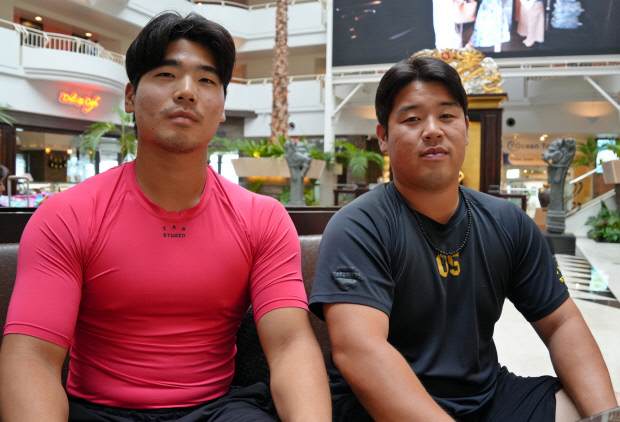 ![]() KIA 타이거즈의 ‘거포’ 외야수 한승연(왼쪽)과 내야수 박상준이 일본 오키나와 마무리캠프 숙소에서 인터뷰를 하고 있다. |
