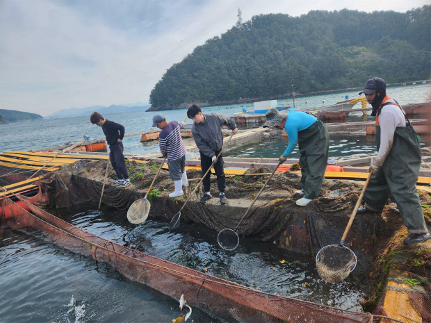 ![]() 국립수산과학원 아열대수산연구소 연구사들이 해상 가두리양식장에서 시험 양식중인 벤자리를 살펴보고 있다. <국립수산과학원 아열대수산연구소 제공> |
