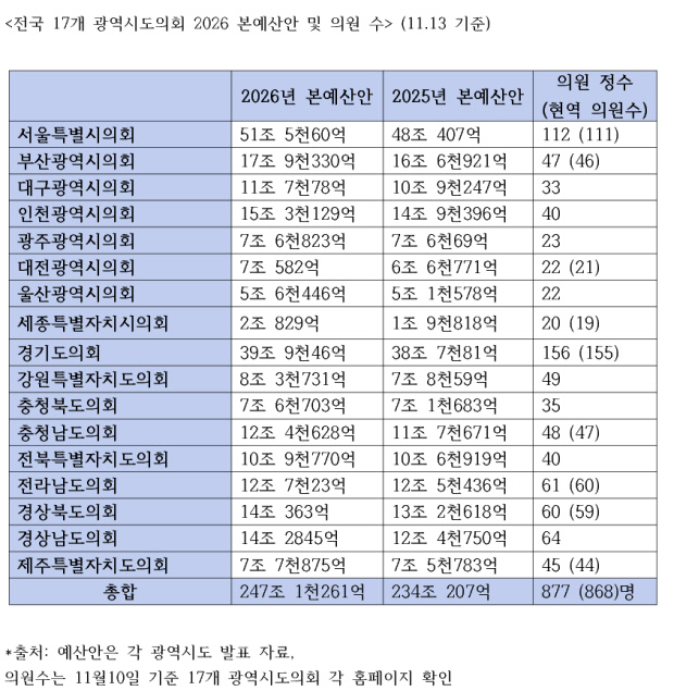 전국 17개 시·도의 내년 본예산은 247조1261억원으로, 전국 877명의 광역의원 1인당 약 2817억원의 예산을 심의·확정한다.