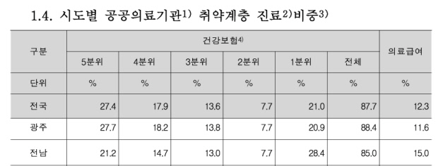 지난해 전남지역 공공의료기관에서 입원 진료를 받은 건강보험료 납부자 가운데 납부 수준이 가장 낮은 1분위 비중은 28.4%로, 전국 평균 비중(21.0%)을 크게 웃돌고 17개 시·도 가운데 가장 높았다. 의료급여 수급자 비중도 15.0%로, 전국 평균 12.3%를 상회했다.