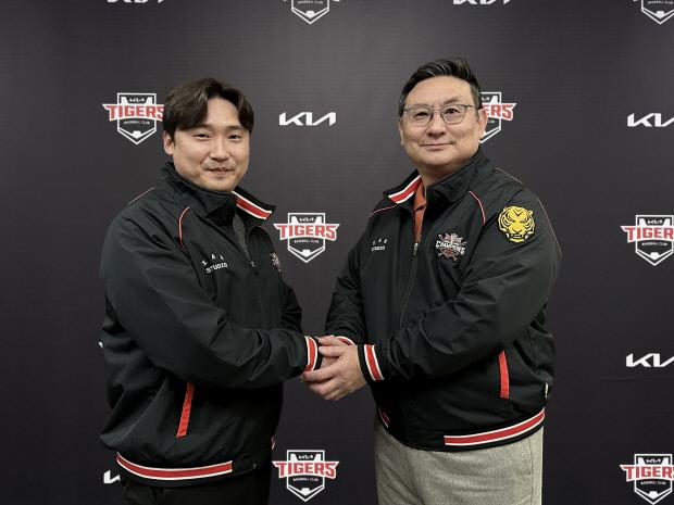KIA와 FA계약을 체결한 이준영(왼쪽)이 심재학 단장과 포즈를 취하고 있다. <KIA 타이거즈 제공>