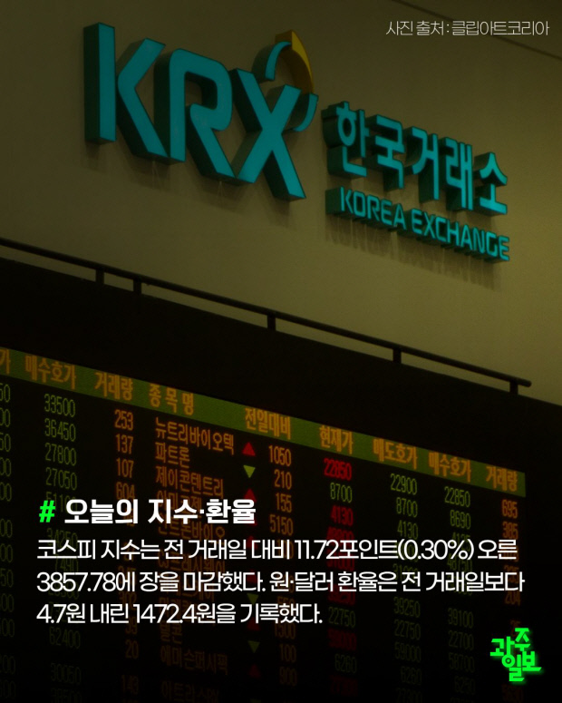 코스피 지수는 전 거래일 대비 11.72포인트(0.30%) 오른 3857.78에 장을 마감했다. 원·달러 환율은 전 거래일보다 4.7원 내린 1472.4원을 기록했다.