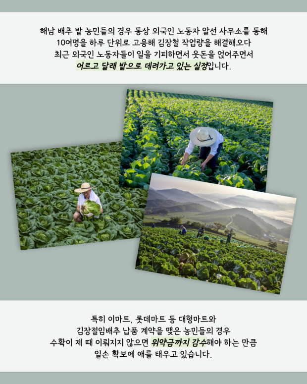 특히 이마트, 롯데마트 등 대형마트와 김장절임배추 납품 계약을 맺은 농민들의 경우 수확이 제 때 이뤄지지 않으면 위약금까지 감수해야 하는 만큼 일손 확보에 애를 태우고 있습니다.