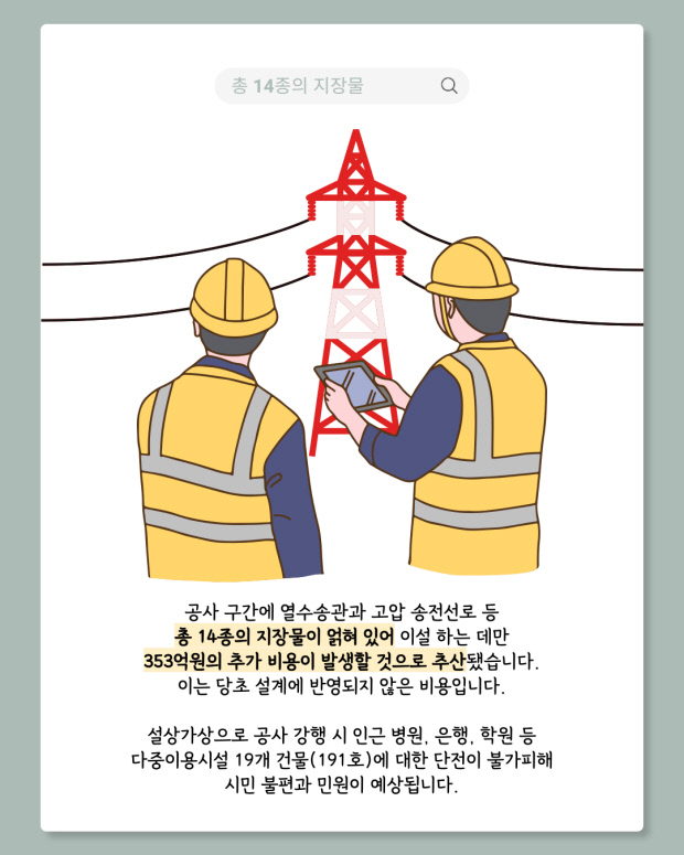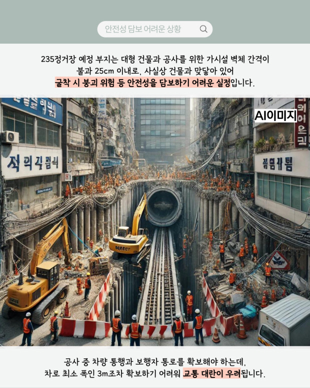 235정거장 예정 부지는 대형 건물과 공사를 위한 가시설 벽체 간격이 불과 25cm 이내로, 사실상 건물과 맞닿아 있어 굴착 시 붕괴 위험 등 안전성을 담보하기 어려운 실정입니다.
