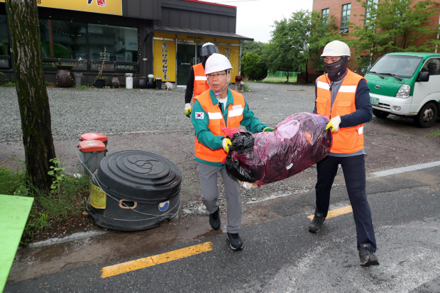 ![]() 박병규(왼쪽) 광산구청장이 생활폐기물 종량제 봉투 수거를 직접 하고 있다. <광산구 제공> |