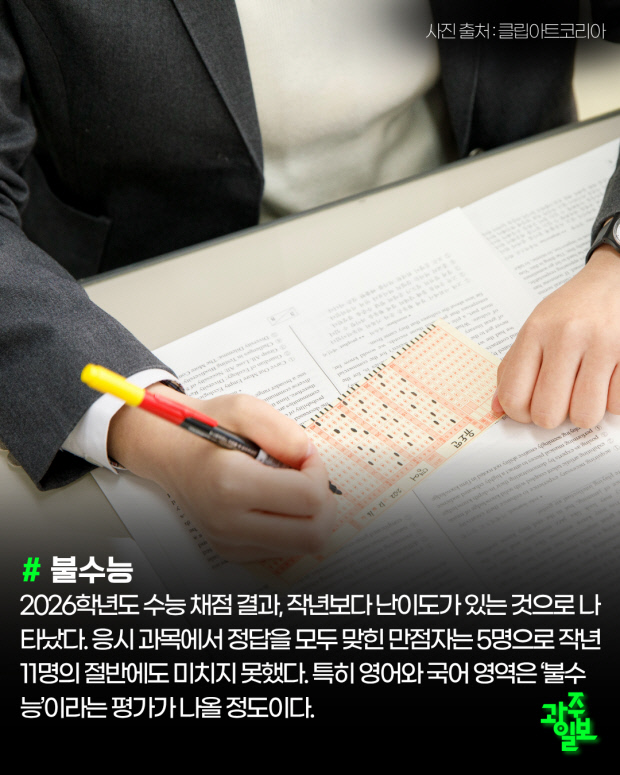 2026학년도 수능 채점 결과, 작년보다 난이도가 있는 것으로 나타났다. 응시 과목에서 정답을 모두 맞힌 만점자는 5명으로 작년 11명의 절반에도 미치지 못했다. 특히 영어와 국어 영역은 ‘불수능’이라는 평가가 나올 정도이다.