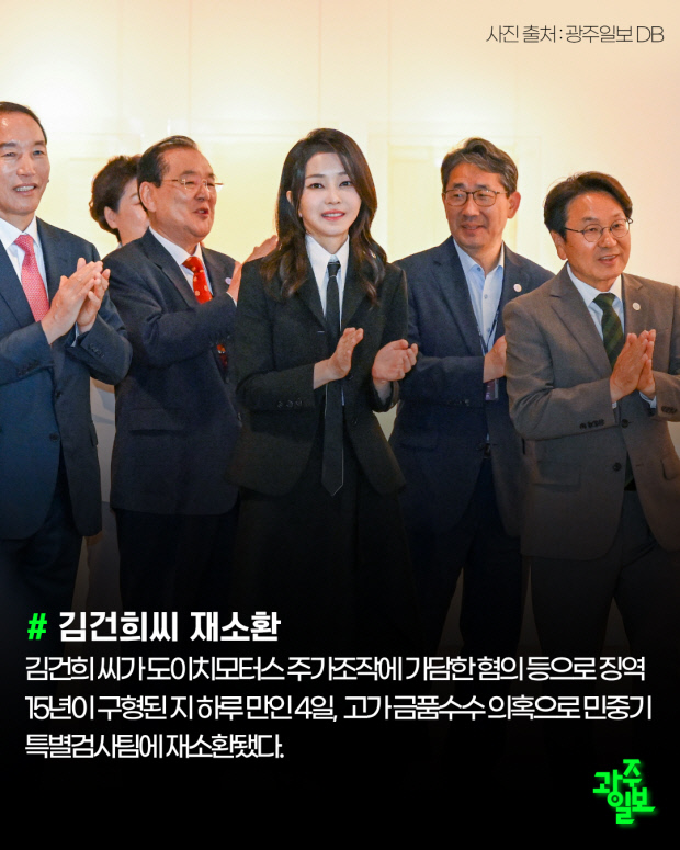 김건희 씨가 도이치모터스 주가조작에 가담한 혐의 등으로 징역 15년이 구형된 지 하루 만인 4일, 고가 금품수수 의혹으로 민중기 특별검사팀에 재소환됐다.