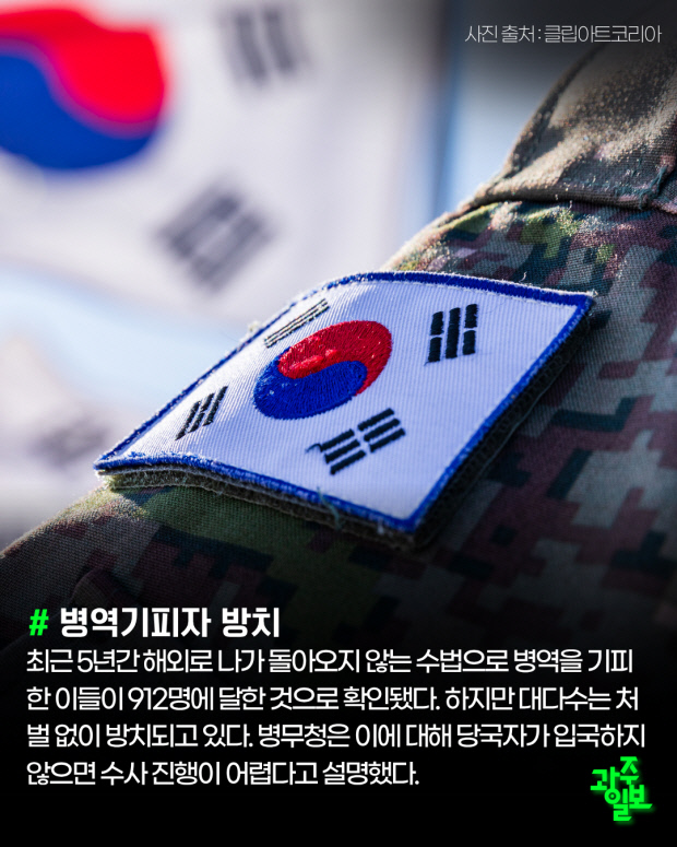 최근 5년간 해외로 나가 돌아오지 않는 수법으로 병역을 기피한 이들이 912명에 달한 것으로 확인됐다. 하지만 대다수는 처벌 없이 방치되고 있다. 병무청은 이에 대해 당국자가 입국하지 않으면 수사 진행이 어렵다고 설명했다.
