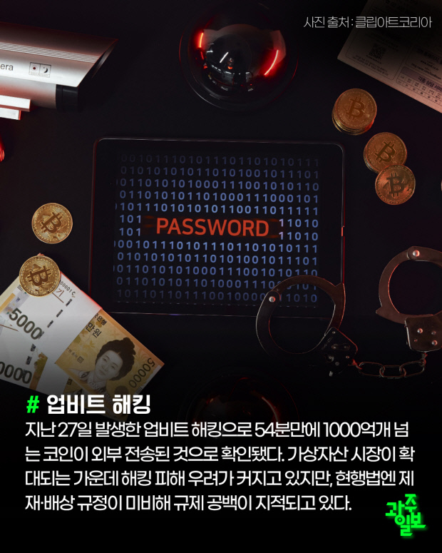 지난 27일 발생한 업비트 해킹으로 54분만에 1000억개 넘는 코인이 외부 전송된 것으로 확인됐다. 가상자산 시장이 확대되는 가운데 해킹 피해 우려가 커지고 있지만, 현행법엔 제재·배상 규정이 미비해 규제 공백이 지적되고 있다.