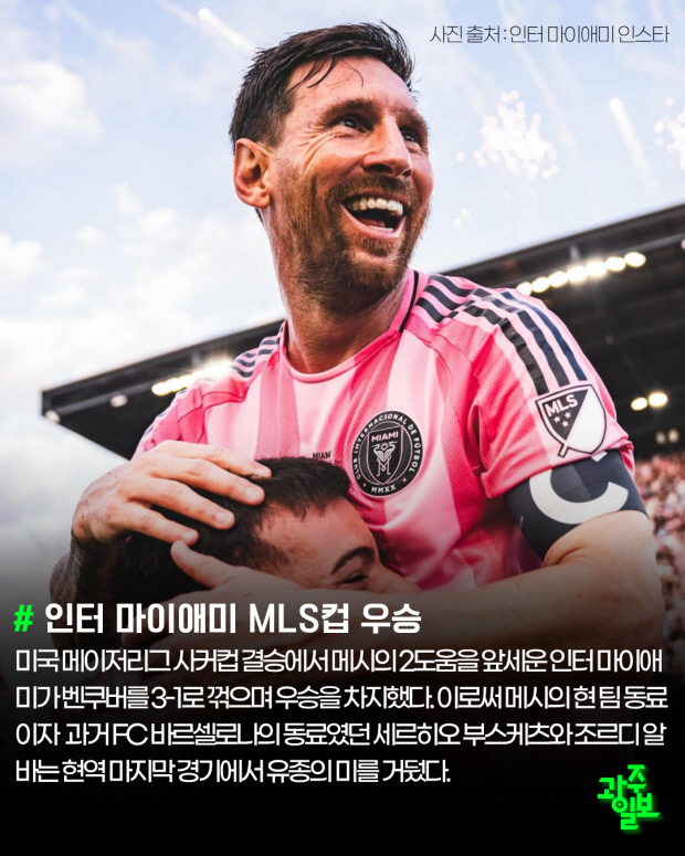 미국 메이저리그 사커컵 결승에서 메시의 2도움을 앞세운 인터 마이애미가 벤쿠버를 3-1로 꺾으며 우승을 차지했다. 이로써 메시의 현 팀 동료이자 과거 FC 바르셀로나의 동료였던 세르히오 부스케츠와 조르디 알바는 현역 마지막 경기에서 유종의 미를 거뒀다.