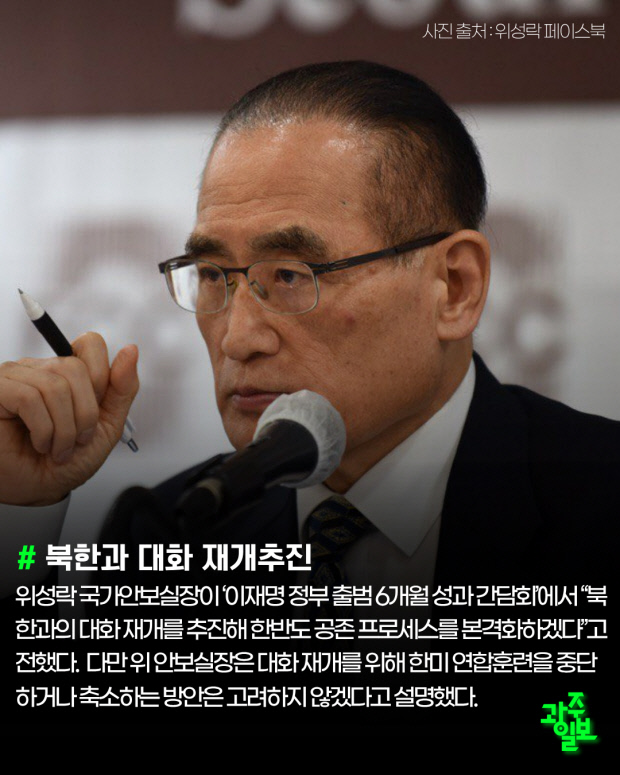 위성락 국가안보실장이 ‘이재명 정부 출범 6개월 성과 간담회’에서 “북한과의 대화 재개를 추진해 한반도 공존 프로세스를 본격화하겠다”고 전했다. 다만 위 안보실장은 대화 재개를 위해 한미 연합훈련을 중단하거나 축소하는 방안은 고려하지 않겠다고 설명했다.