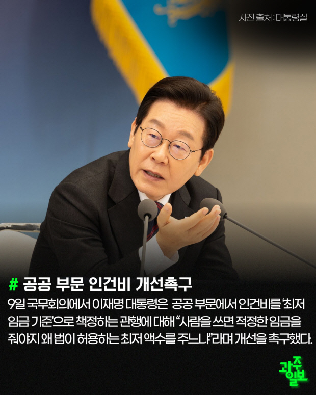 9일 국무회의에서 이재명 대통령은 공공 부문에서 인건비를 ‘최저임금 기준’으로 책정하는 관행에 대해 “사람을 쓰면 적정한 임금을 줘야지 왜 법이 허용하는 최저 액수를 주느냐”라며 개선을 촉구했다.