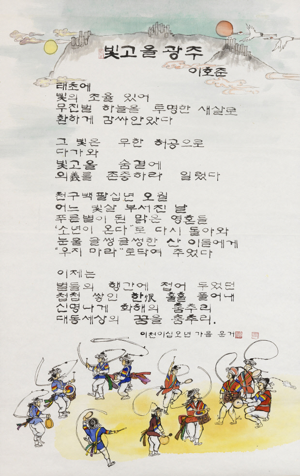 이호준의 ‘빛고을 광주’는 직접 시를 쓰고 그림을 그린 작품이다. 빛고을에 스며든 빛이 의를 존중하라 했지만 80년 5월, 빛살은 부서져버렸다. 그러다 ‘푸른 별이 된 맑은 영혼들’이 ‘소년이 온다’로 다시 돌아온다. 시는 신명난 화해의 춤, 대동세상의 꿈을 희원한다는 내용이다. 흥겨운 농악 그림을 배경으로 형상화된 시는 ‘빛고을 광주’의 역사와 정신을 압축적으로 보여준다.