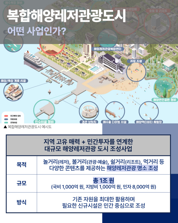 복합해양레저관광도시 조성 사업은 지역 고유의 매력을 활용하면서 민간투자와 연계해, 해양레저관광 기능이 집약된 대규모 해양관광도시를 조성하는 사업이다.