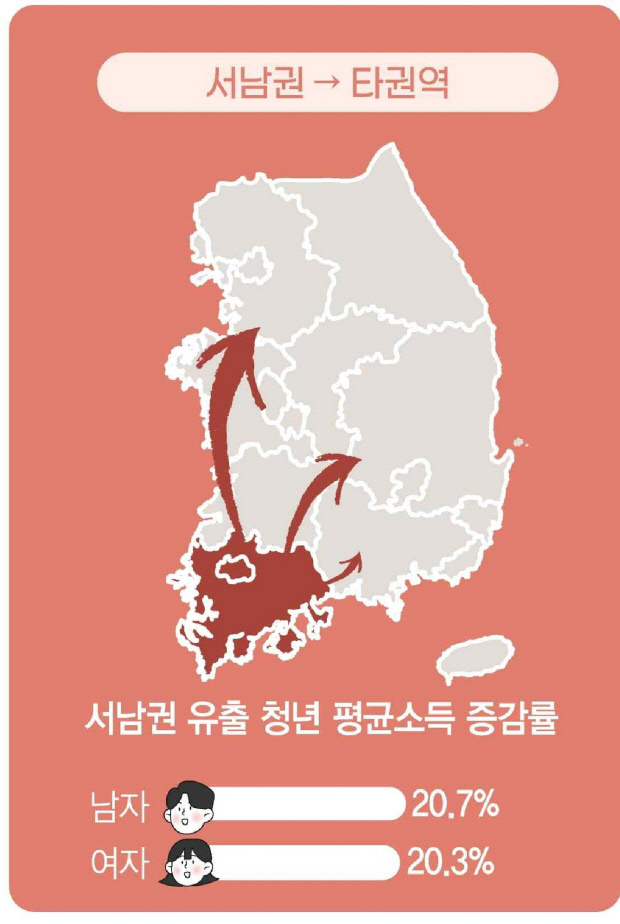 광주·전남 청년이 일자리를 수도권으로 옮겼을 때 소득은 2282만원에서 2922만원으로, 평균 28.0%(640만원) 더 많아졌다. 비수도권으로 옮겼을 때의 증가율은 15.7%에 그쳤다.