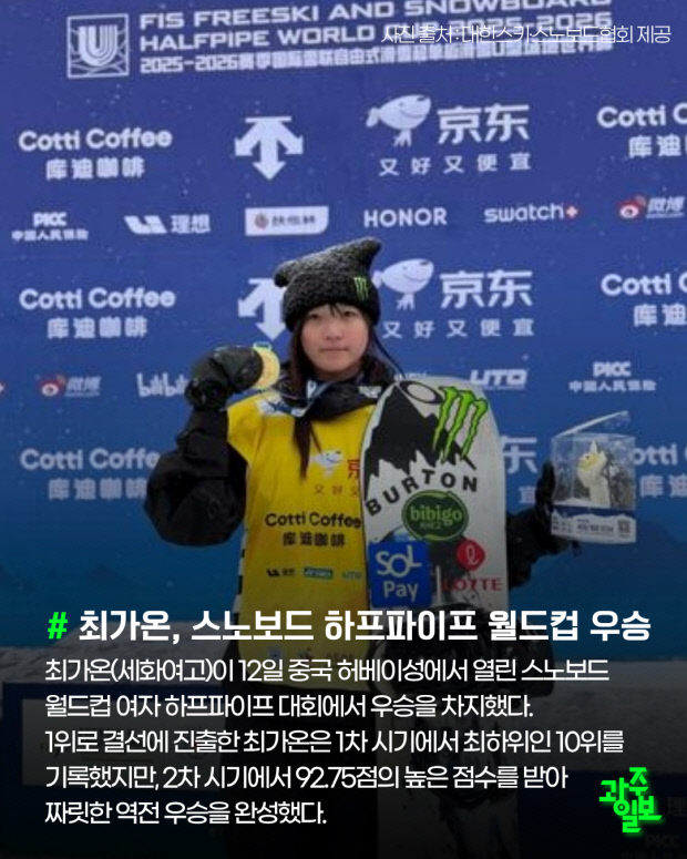 최가온(세화여고)이 12일 중국 허베이성에서 열린 스노보드 월드컵 여자 하프파이프 대회에서 우승을 차지했다. 1위로 결선에 진출한 최가온은 1차 시기에서 최하위인 10위를 기록했지만, 2차 시기에서 92.75점의 높은 점수를 받아 짜릿한 역전 우승을 완성했다.
