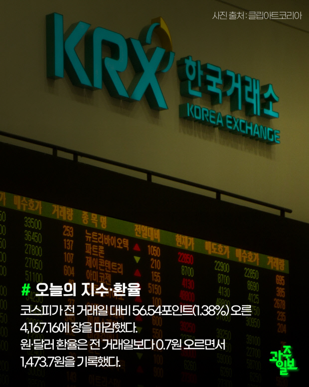 코스피가 전 거래일 대비 56.54포인트(1.38%) 오른 4,167.16에 장을 마감했다. 원·달러 환율은 전 거래일보다 0.7원 오르면서 1,473.7원을 기록했다.