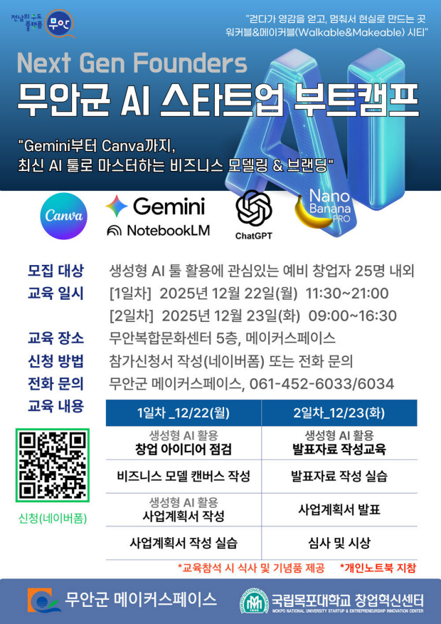 무안군이 22일부터 23일까지 무안읍 메이커스페이스(일반랩)에서 열리는 ‘무안군 AI 스타트업 부트캠프’에 참가할 예비·초기 창업자를 모집한다. 이번 캠프는 25명을 대상으로 ‘Gemini부터 Canva까지, 최신 AI 툴로 마스터하는 비즈니스 모델링 & 브랜딩’을 주제로 실무 중심의 교육이 이뤄진다. 참가자는 생성형 AI툴을 활용해 ▲창업 아이템 검증 및 자료조사 ▲사업계획서 작성 및 멘토링 ▲모의 발표 및 평가까지 창업 실무 과정을 배우게 되며, 우수 발표자에게는 시상도 진행된다. 참가 신청은 네이버폼이나 전화를 통해 할 수 있다.