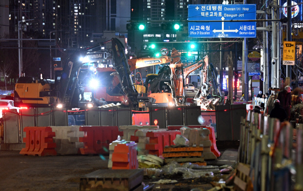 영하권으로 기온이 떨어진 14일 오후 7시께 광주시 남구 국제양궁장 앞 도시철도 2호선 공사 현장에서 굴착기 등 중장비가 쉴 새 없이 움직이고 있다. 광주시가 시민에게 약속한 22일 도로 전면개방 일정을 맞추기 위해 야간 작업이 진행되고 있다. /나명주 기자 mjna@kwangju.co.kr