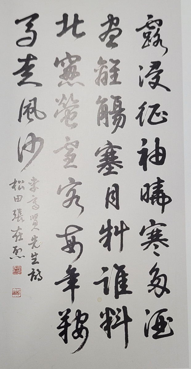 장재열 회장은 고려 후기의 문인 익재 이제현의 글을 출품했다. 초야에 묻혀 사는 가난한 선비의 올곧은 마음을 투영한 작품이다. “이슬 내려 소매를 적시니 새벽 찬기운 늘고/ 술이 다해 술잔 내리니 변방의 달이 비끼네./ 누가 북창의 가난한 선비를 헤어려 주리오./ 매년 말안장에 앉아 모래바람을 달리네.”