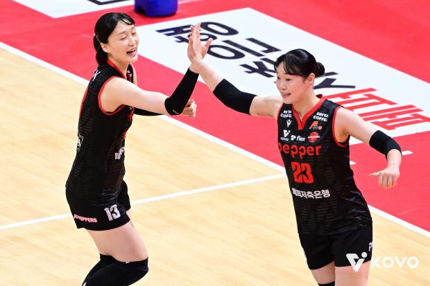 ![]() 페퍼스의 세터 이원정이 지난 17일 페퍼스타디움에서 열린 V리그 3라운드 IBK기업은행과의 맞대결을 통해 부상 복귀전을 치렀다. 지난 시즌 마지막 경기에서 아웃사이드 히터 박은서와 하이파이브를 하고 있는 이원정(오른쪽). <KOVO 제공> |
