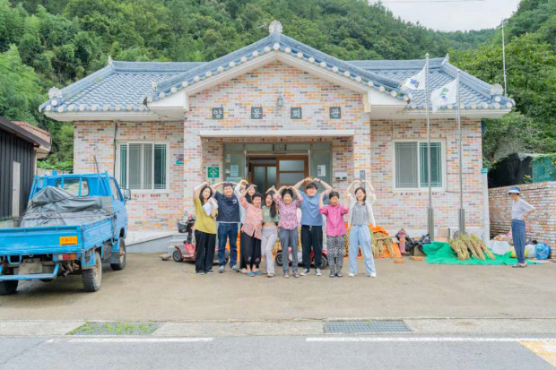![]() 청년마을 ‘전체차랩’ 회원들이 주민들과 마을회관 앞에서 함께 환하게 웃고 있다. <전체차랩 제공> |