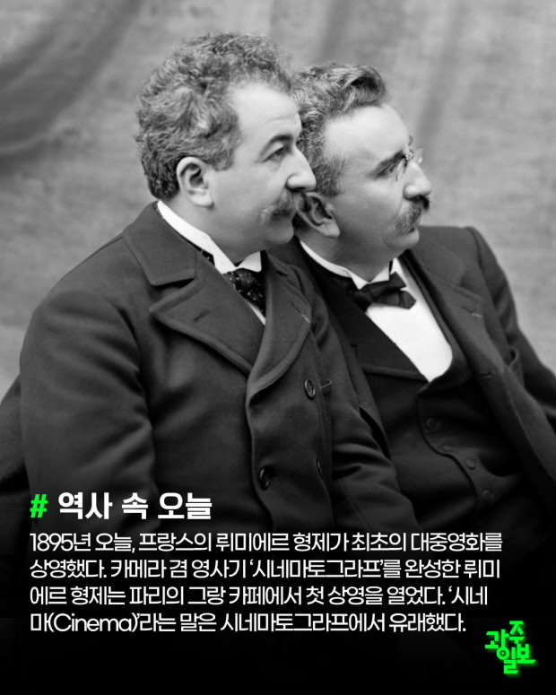 1895년 오늘, 프랑스의 뤼미에르 형제가 최초의 대중영화를 상영했다. 카메라 겸 영사기 ‘시네마토그라프’를 완성한 뤼미에르 형제는 파리의 그랑 카페에서 첫 상영을 열었다. ‘시네마(Cinema)’라는 말은 시네마토그라프에서 유래했다.