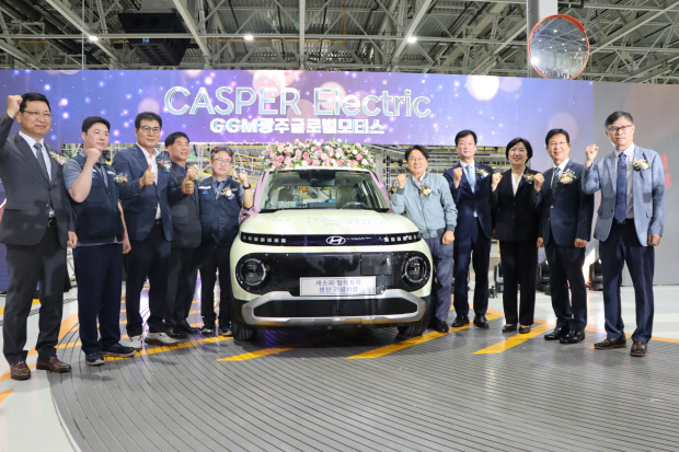 윤몽현 광주글로벌모터스(GGM) 대표이사 등이 지난해 7월 열린 캐스퍼 일렉트릭 1호차 생산 기념식에서 기념 촬영을 하고 있다. <GGM 제공>