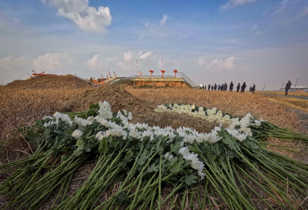 ![]() 12.29 제주항공 여객기 참사 1주기인 29일 사고 현장인 둔덕(로컬라이저) 주변에 유가족들이 놓고 간 국화꽃들이 수북이 쌓여 있다.