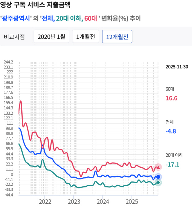 연말 들어 광주 지역민의 영상 구독 서비스(OTT) 지출금액이 20대 이하부터 40대까지는 1년 전보다 줄었지만 50~70대 이상은 증가한 것으로 나타났다.