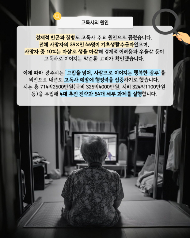이에 따라 광주시는 ‘고립을 넘어, 사람으로 이어지는 행복한 광주’를 비전으로 내년도 고독사 예방에 행정력을 집중하기로 했습니다. 시는 총 714억2500만원(국비 325억4000만원, 시비 324억1100만원 등)을 투입해 4대 추진 전략과 54개 세부 과제를 실행합니다.