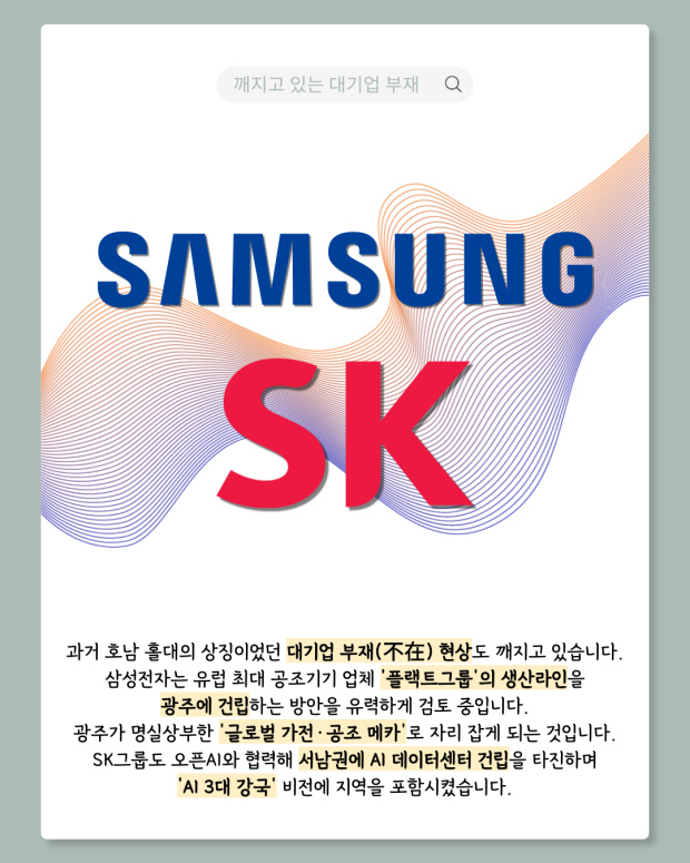 과거 호남 홀대의 상징이었던 대기업 부재(不在) 현상도 깨지고 있습니다. 삼성전자는 유럽 최대 공조기기 업체 ‘플랙트그룹’의 생산라인을 광주에 건립하는 방안을 유력하게 검토 중입니다. SK그룹도 오픈AI와 협력해 서남권에 AI 데이터센터 건립을 타진하며 ‘AI 3대 강국’ 비전에 지역을 포함시켰습니다.