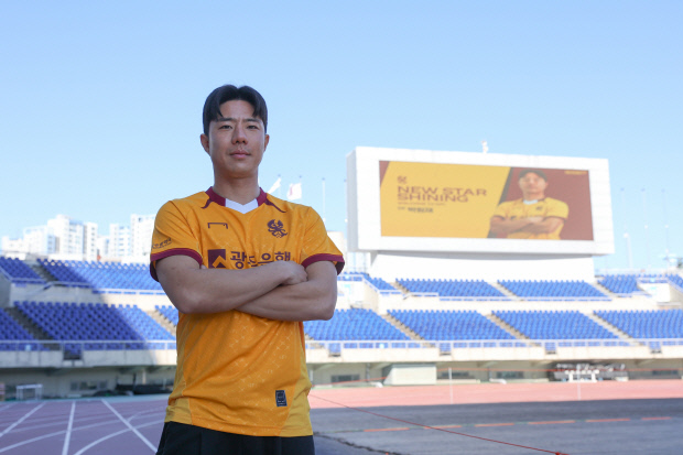 ![]() 광주FC 유니폼을 입은 박원재가 광주월드컵경기장에서 포즈를 취하고 있다. <광주FC 제공> |