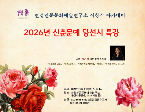 연경인문문화예술연구소는 시 창작아카데미 일환으로 ‘2026년 신춘문예 당선 시 특강’을 연다. 오는 8일 오후 4시이며, 강사는 시인인 석연경 문학평론가.