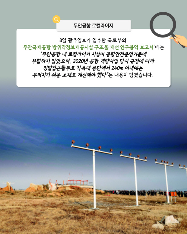 8일 광주일보가 입수한 국토부의 ‘무안국제공항 방위각정보제공시설 구조물 개선 연구용역 보고서’에는 “무안공항 내 로컬라이저 시설이 공항안전운영기준에 부합하지 않았으며, 2020년 공항 개량사업 당시 규정에 따라 정밀접근활주로 착륙대 종단에서 240m 이내에는 부러지기 쉬운 소재로 개선해야 했다”는 내용이 담겼습니다.