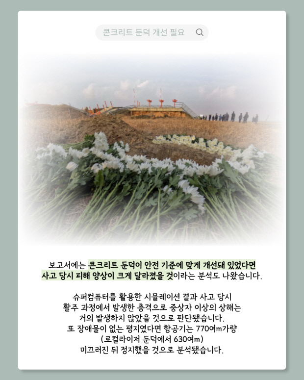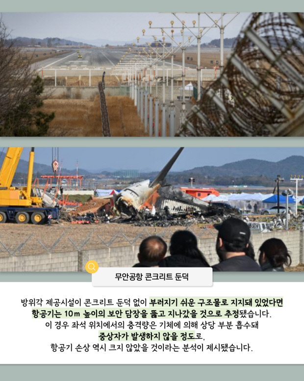 방위각 제공시설이 콘크리트 둔덕 없이 부러지기 쉬운 구조물로 지지돼 있었다면 항공기는 10m 높이의 보안 담장을 뚫고 지나갔을 것으로 추정됐습니다. 이 경우 좌석 위치에서의 충격량은 기체에 의해 상당 부분 흡수돼 중상자가 발생하지 않을 정도로, 항공기 손상 역시 크지 않았을 것이라는 분석이 제시됐습니다.