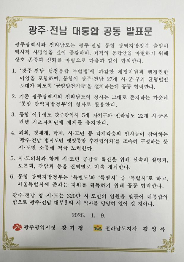 한편, 이날 오전 이재명 대통령은 청와대 오찬에서 “광주·전남 통합은 국가 균형발전의 핵심 모델”이라며 적극적인 지원을 약속해 향후 통합 특별법 제정과 국회 통과 과정에도 탄력이 붙을 전망이다.