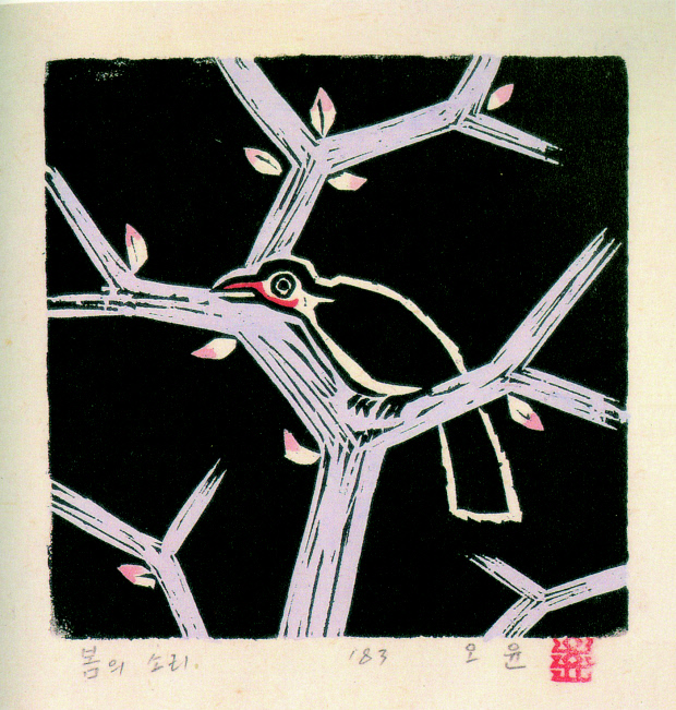 한겨울에 보는 작품 ‘봄의 소리’는 반갑다. 봄이 멀지 않았음을 환기하는데 새 한마리가 메마른 가지에 앉아 있는 모습이 인상적이다. 불그스름한 움이 트는 나뭇가지마다 다가올 봄에 대한 기대가 감돈다. 추운 겨울이 점차 물러가고 새봄이 다가오고 있음을 보여준다.