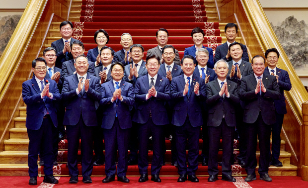 ![]() 이재명 대통령이 지난 9일 광주·전남 행정통합과 관련해 청와대 오찬 간담회에 참석한 강기정 광주시장과 김영록 전남지사, 지역 국회의원들과 함께 기념촬영을 하고 있다. <청와대제공> |