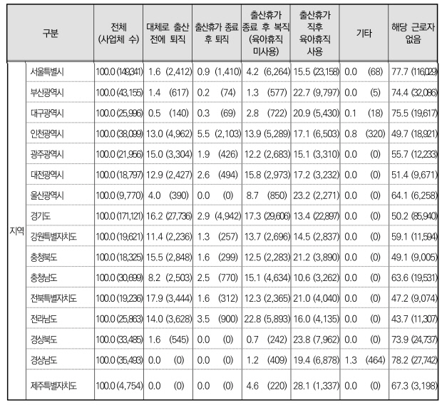 출산전후휴가(3개월)를 전혀 쓸 수 없는 사업장은 광주 14.0%·전남 19.1%이었다. 출산휴가 제도를 2024년 사용한 사업체는 광주 10.4%·전남 16.3%에 그쳤다.