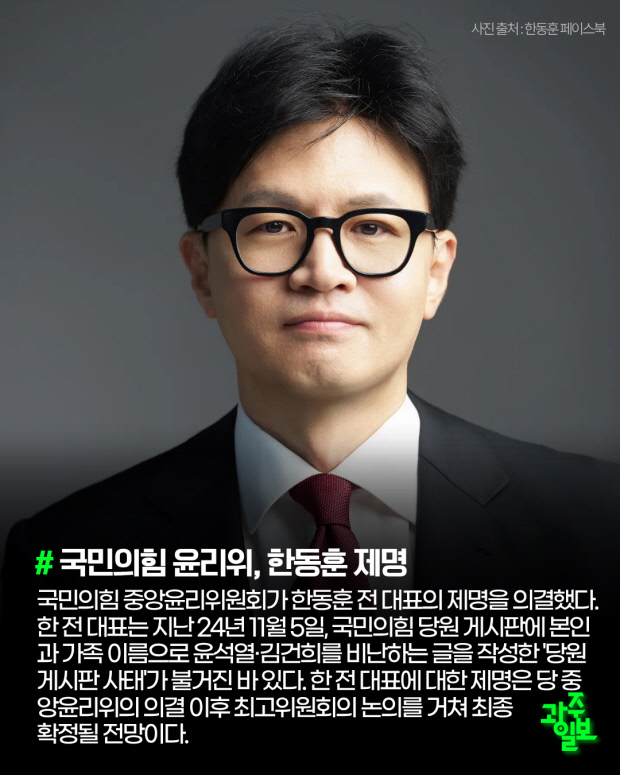 국민의힘 중앙윤리위원회가 한동훈 전 대표의 제명을 의결했다. 한 전 대표는 지난 24년 11월 5일, 국민의힘 당원 게시판에 본인과 가족 이름으로 윤석열·김건희를 비난하는 글을 작성한 ‘당원게시판 사태’가 불거진 바 있다. 한 전 대표에 대한 제명은 당 중앙윤리위의 의결 이후 최고위원회의 논의를 거쳐 최종 확정될 전망이다.
